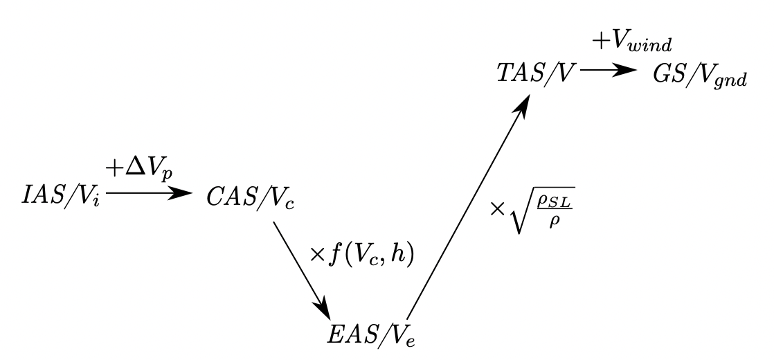 In reality, such a pitot-static device will measure the calibrated airspeed at a point on the aircraft surface, where the flow has already been disturbed by the aircraft. The device is NOT measuring the freestream velicity - thus there is a position error, based on where the pitot-static is on the aircraft. During flight testing, these inaccuracies can be quantified, and a difference between what is indicated by the device, indicated airspeed/IAS, and calibrated airspeed is determined - \(\Delta V_p\), the position error.