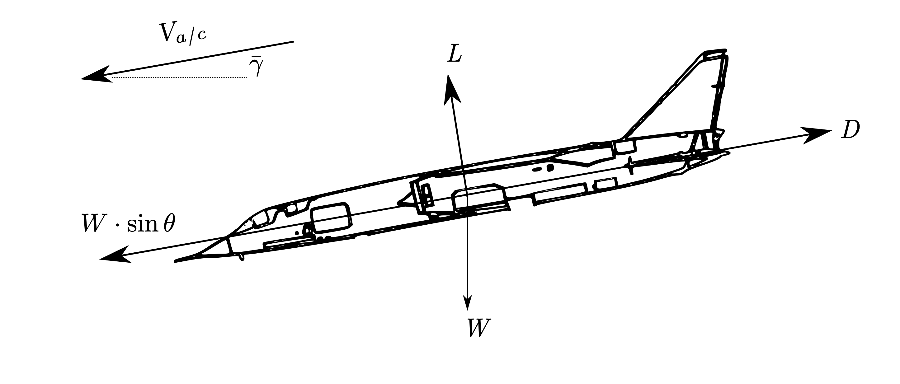 In aircraft performance, the climb or glide angle is denoted by \(\theta\) in numerous texts - for example [And99] - and this angle represents the angle between the aircraft flight direction and the horizontal plane.