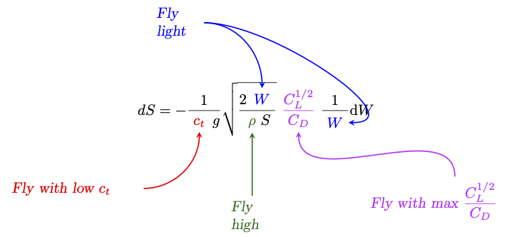 You should be able to see that the range is a function of the starting altitude (to which \(\rho_0\) corresponds) - that is, if a cruise is commenced at a higher altitude, the range will be greater.