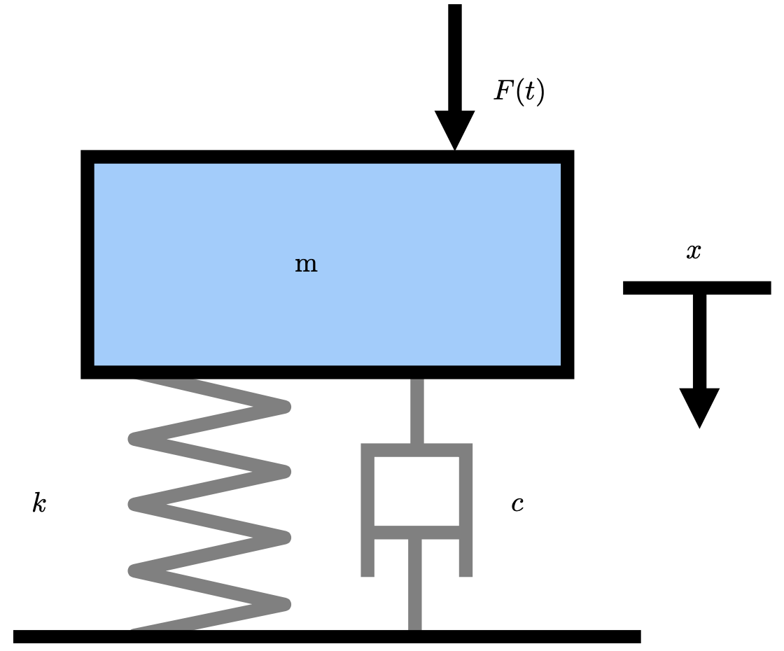 where \(x\) is the displacement, \(m\) is the mass, \(c\) is the damping, \(k\) is the spring stiffness, and \(F(t)\) is the input forcing. For free motion, \(F(t)=0\):