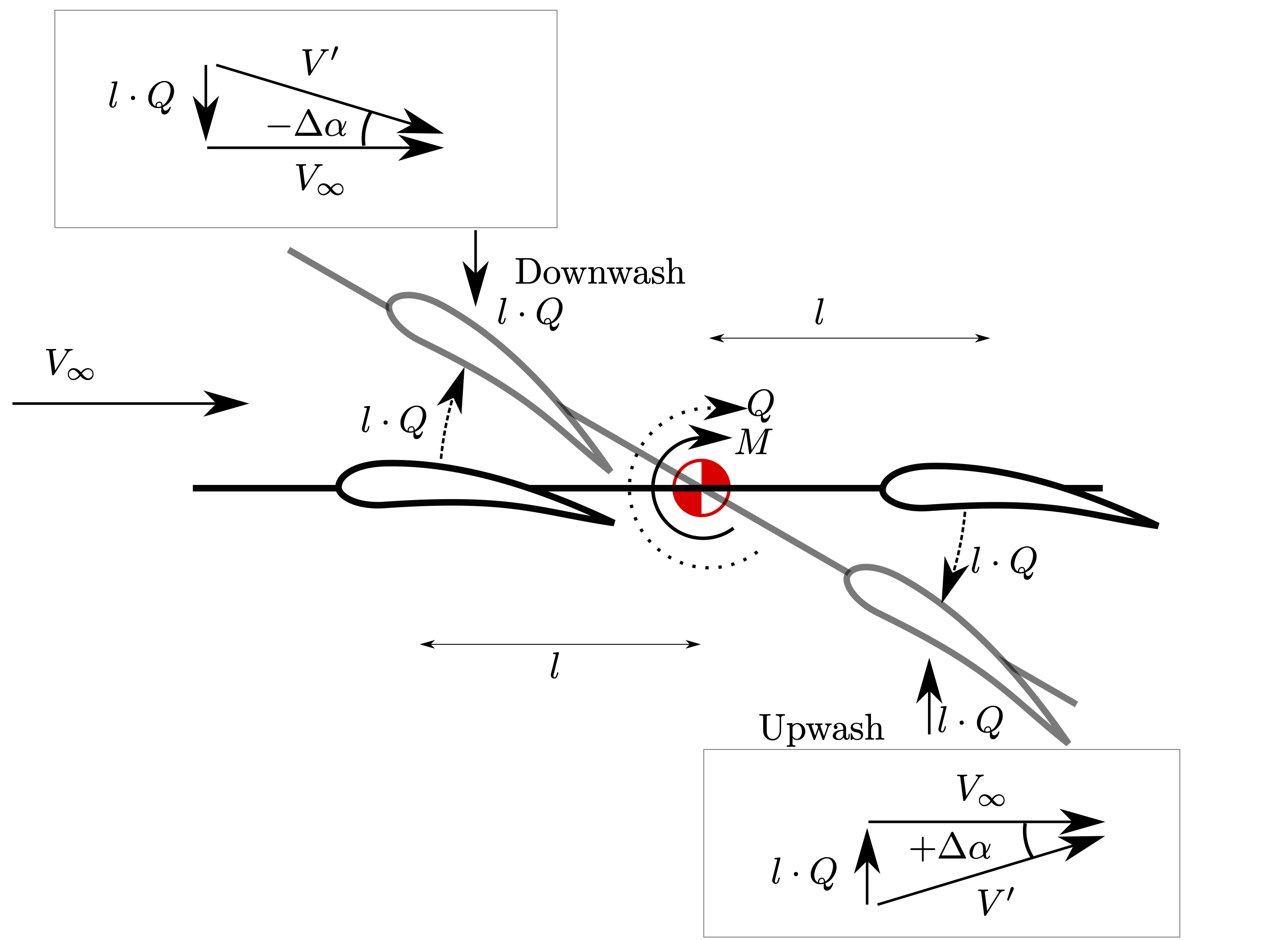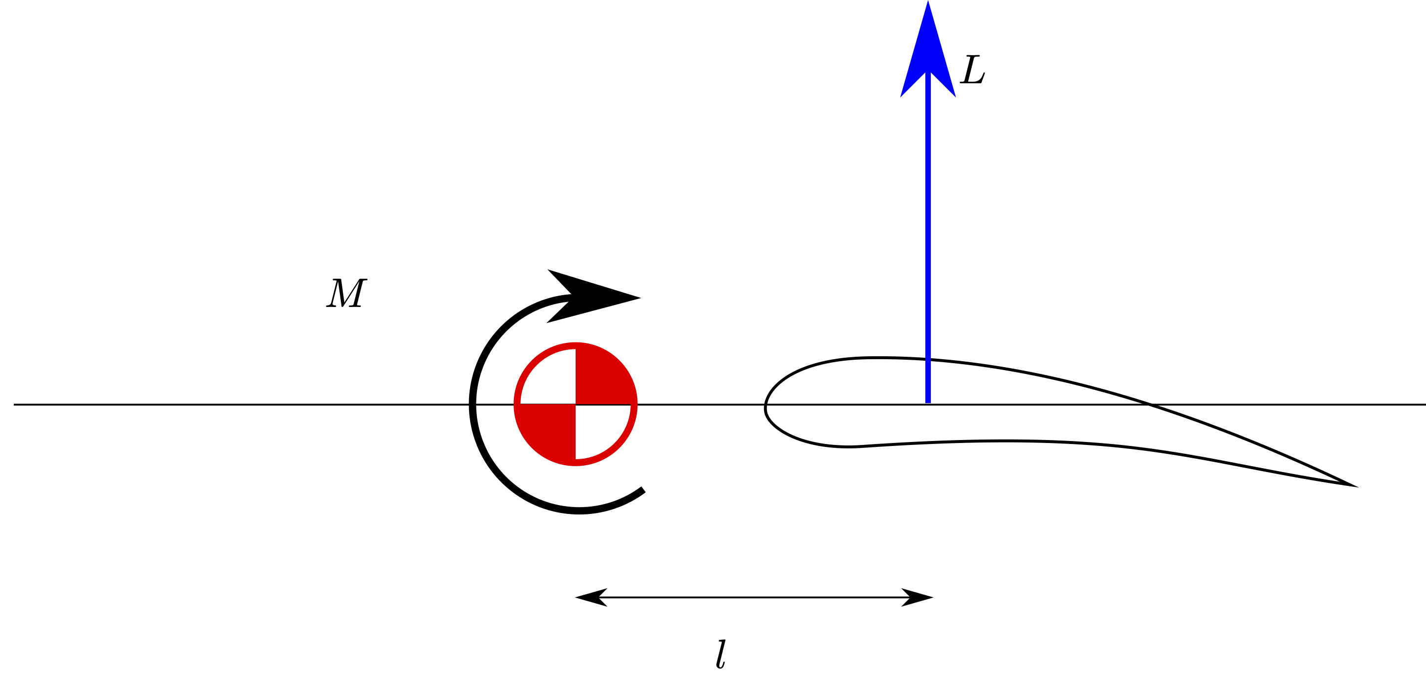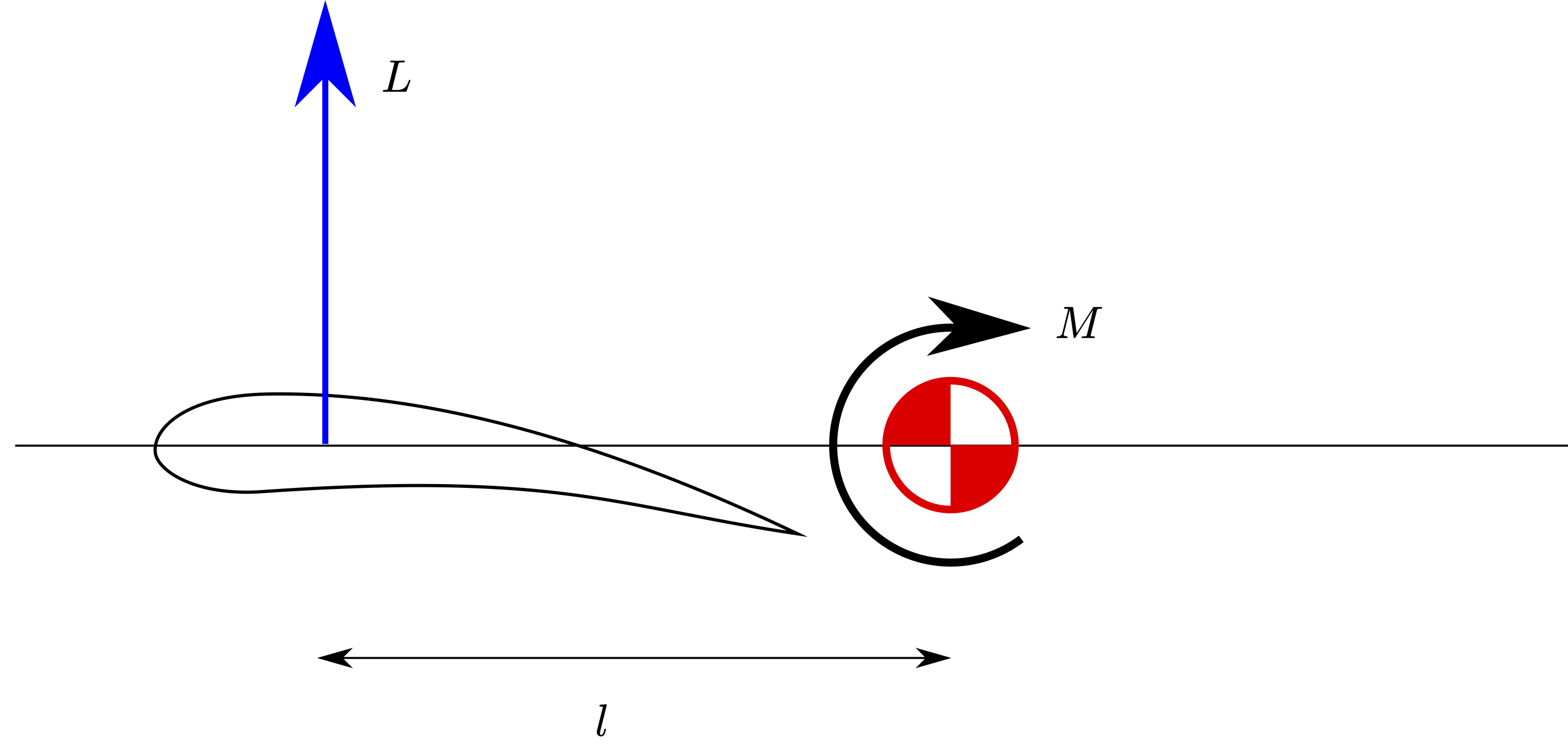 Consider the case with the AC ahead of the CG. The lift is directly proportional to the angle of attack, and the nose-up moment is directly proportional to the lift. In the following, \(M_0\) represents the lift independent pitching moment and the pitching moment at \(\alpha=0\) for the sake of mathematical simplicity.