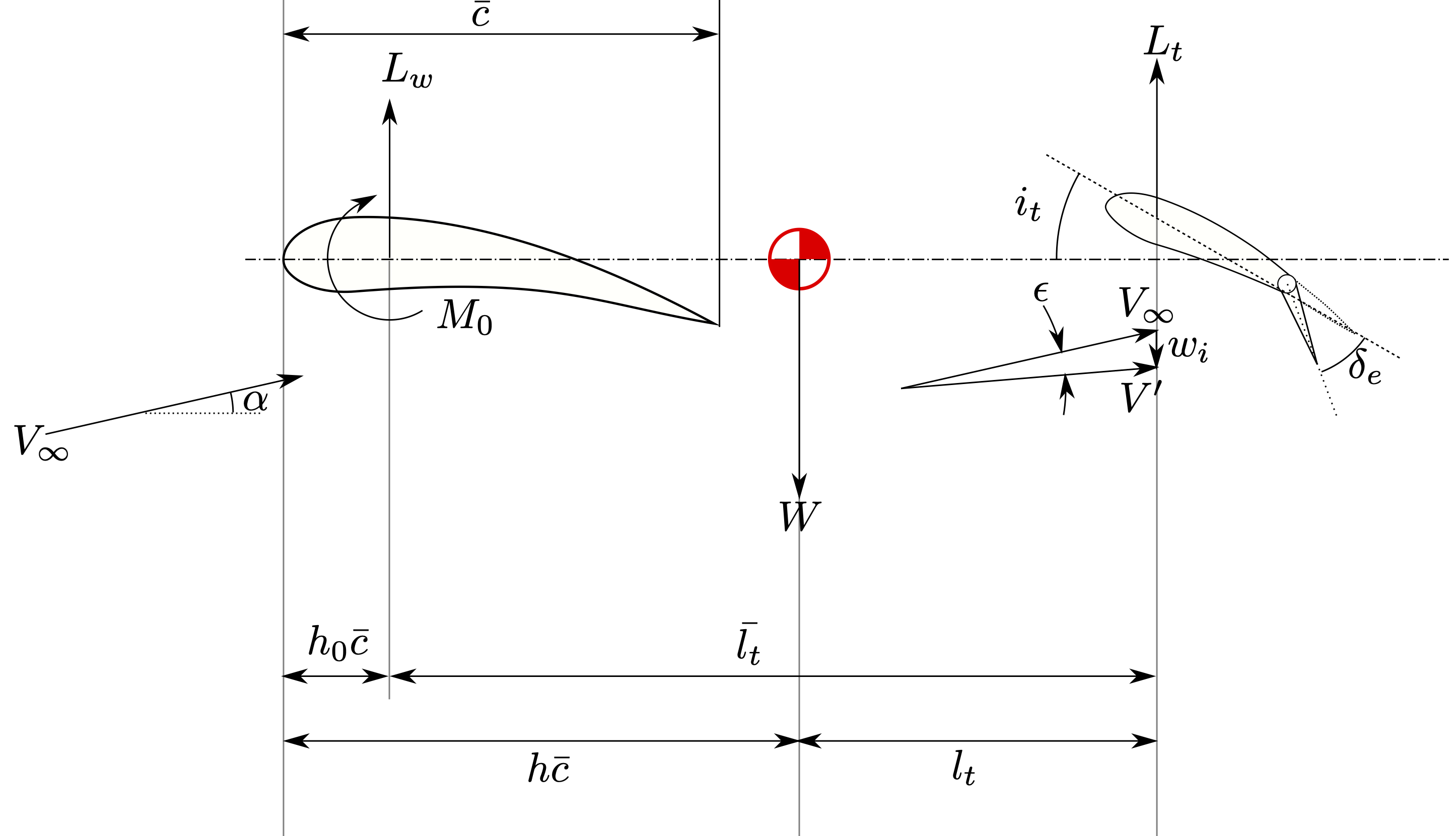 Quantities with a subscript \(()_w\) denote wing quantities, and \(()_t\) denote tail quantities. The dimensional lift is the sum of wing and lift