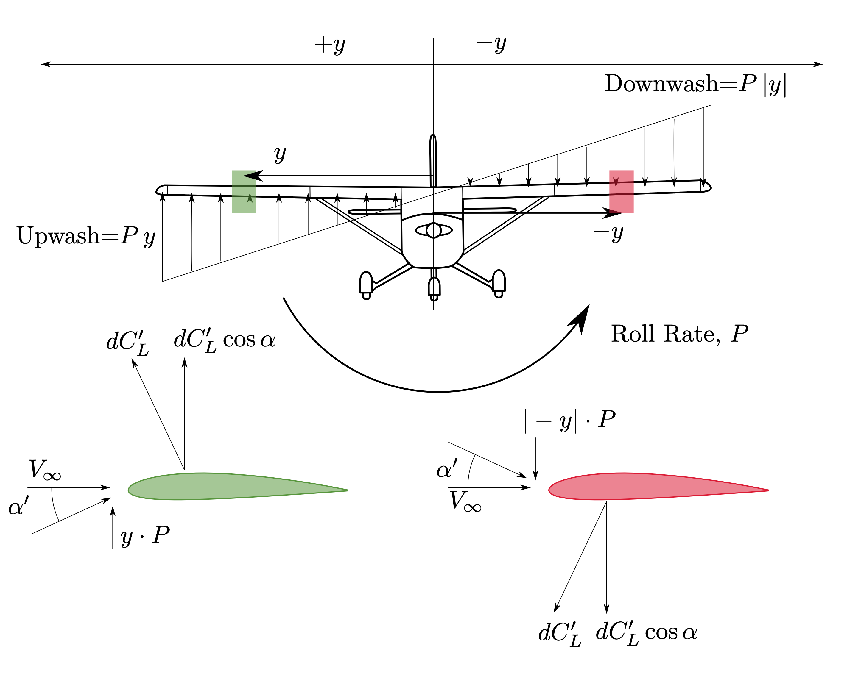 Port wing up \(=\) downwash\(\,\therefore\,\alpha\downarrow\,\therefore C_L\downarrow\,\therefore C_\ell=f(-y\cdot C_L)\downarrow\)